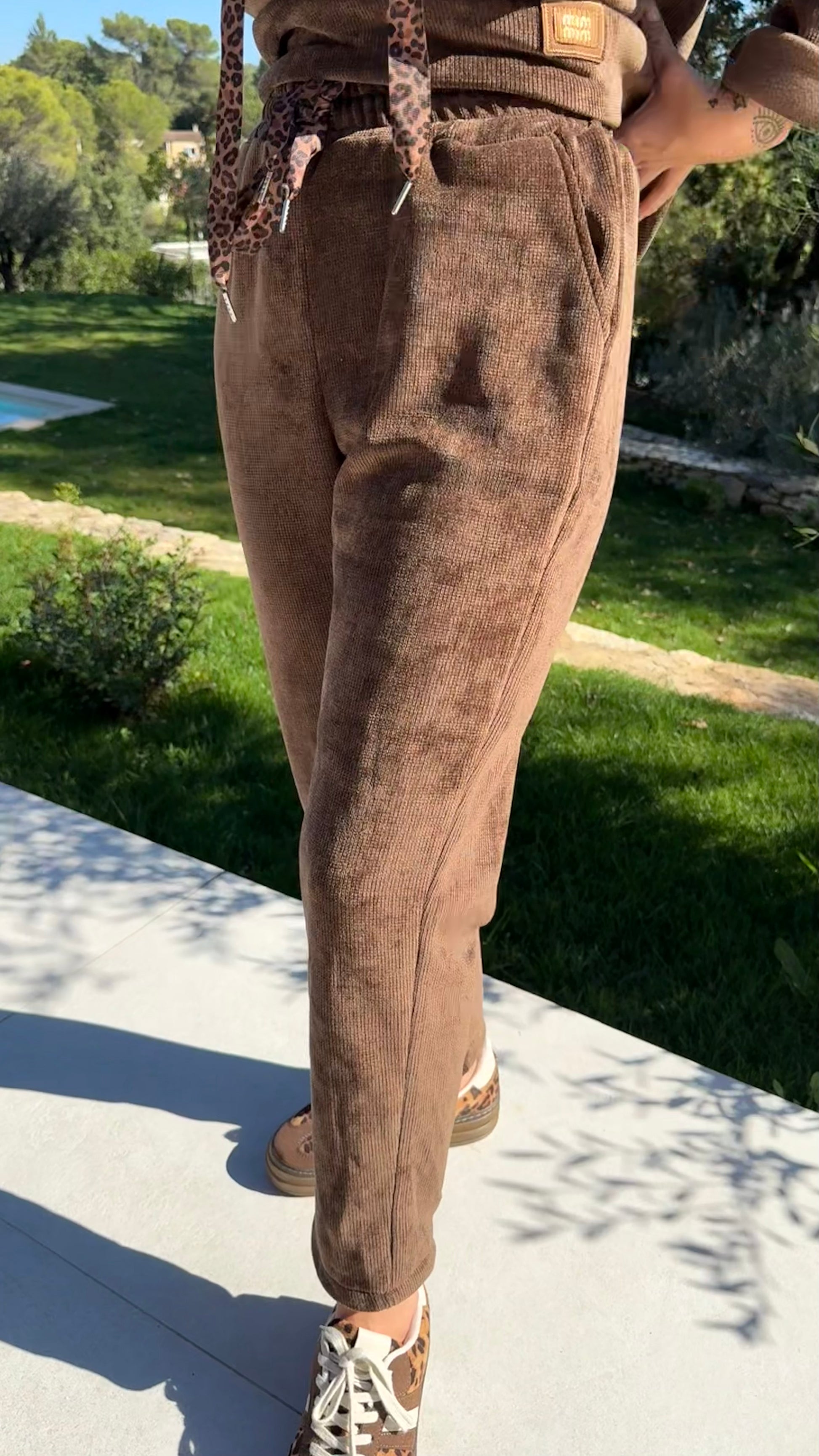 Ensemble jogging en velour chocolat (sweat + pantalon) avec détail en léopard sur la capuche et sur les cordons de serrage du sweat et du pantalon.